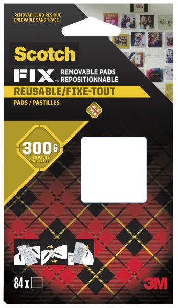Les pastilles adhésifs amovibles Scotch-FIX™ sont des pastilles en pâte, conformables et ne laissant aucun résidu, idéaux pour le montage léger sur des surfaces peintes ou tapissées. Capables de supporter jusqu’à 300 g, ces pastilles adhésifs amovibles adhèrent à une variété de surfaces poreuses et non poreuses.
