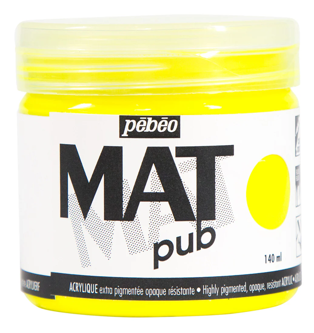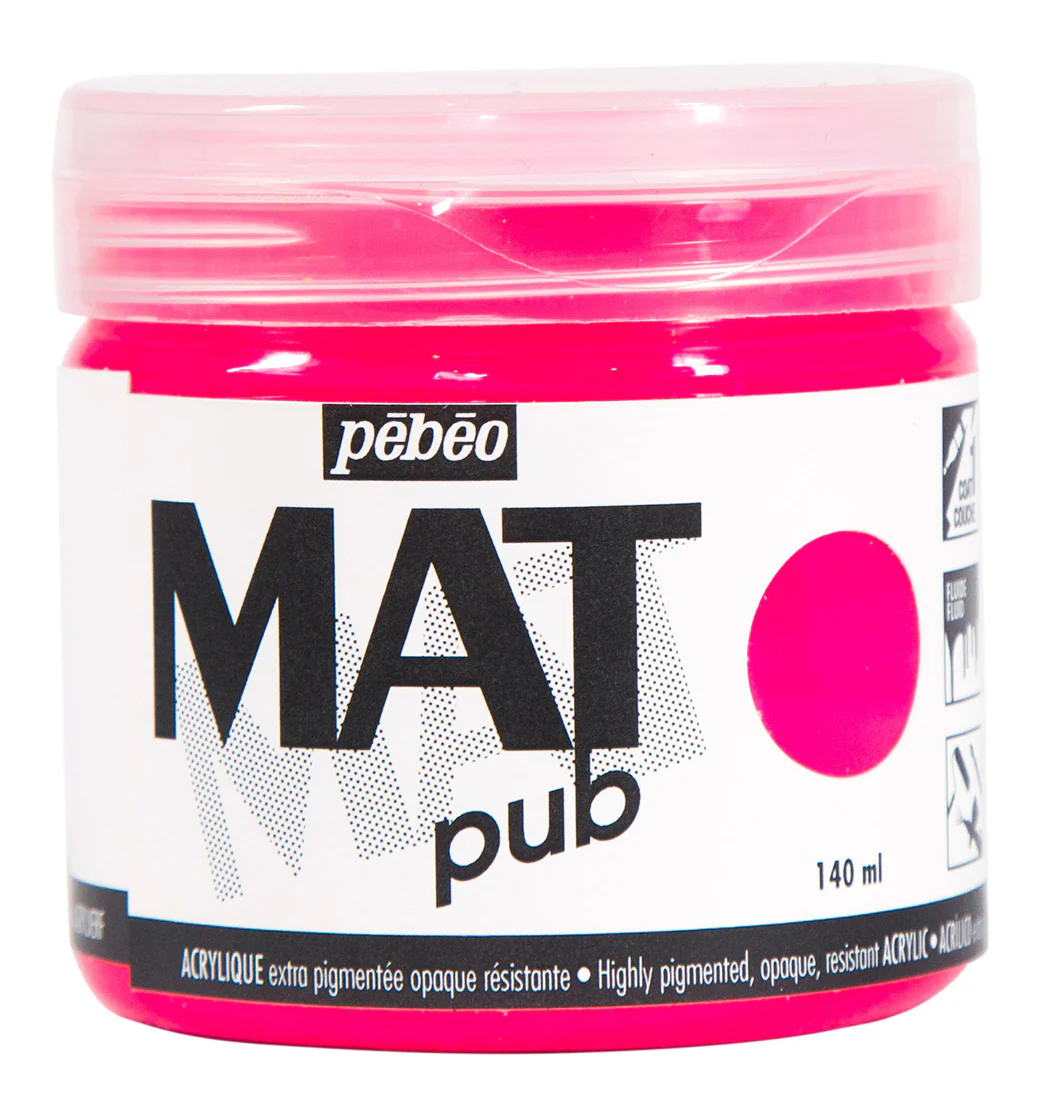 Avec ses 29 couleurs, Mat Pub est une acrylique fluide ultra-mate, couvrante, très résistante aux U-V et aux intempéries, simple et efficace. Elle offre une sélection exigeante de pigments solides à la lumière et sans cadmium. Elle est applicable sur tous supports, y compris en extérieur.