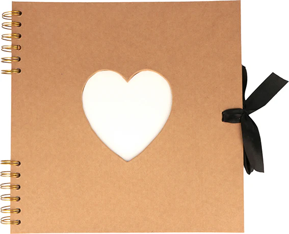 Album à spirales 25×25 cm Kraft composé de 40 pages blanches avec sur la couverture un coeur à décorer et customiser. Le grammage est de 140 gr/m2, une page fait 25 cm x 25 cm environ, l’album mesure 27 cm x 25.5 cm environ