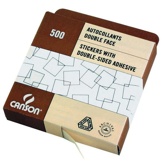 Boîte d’adhésifs double face sans acide, spécialement conçus pour ne pas altérer les photos archivées. Ils se présentent sous forme de carrés positionnés sur une bande enroulée dans une boîte distributrice.