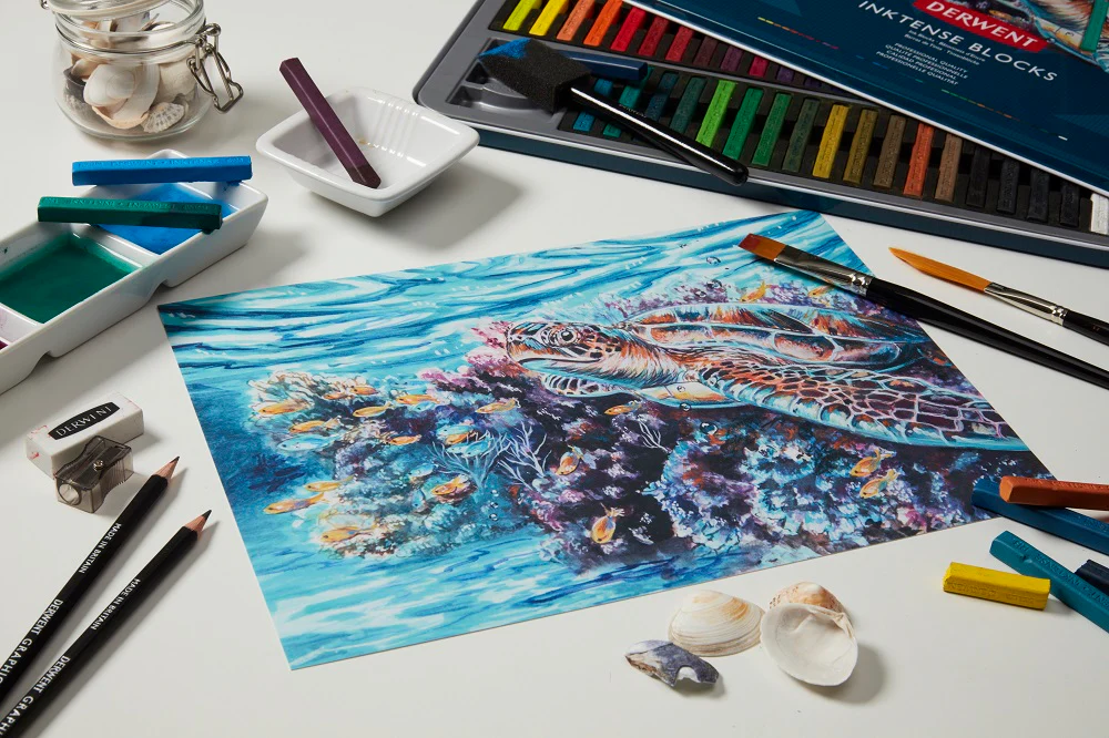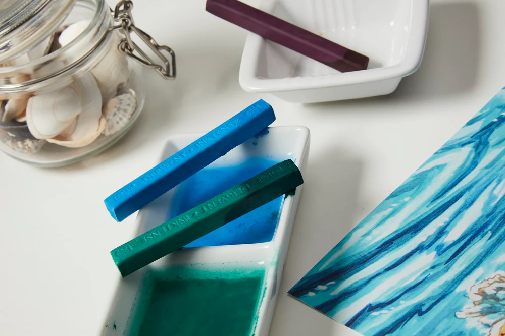 Une fois sèches, la couleur est permanente et peut être travaillée en couches superposées. Polyvalentes, les craies permanentes Inktense peuvent être appliquées sur de nombreuses surfaces poreuses dont la céramique, le bois et le tissu.