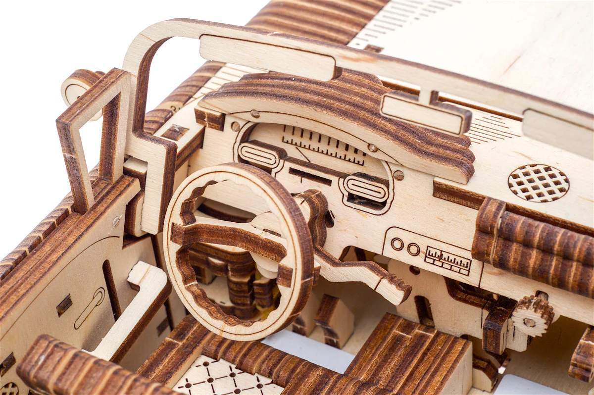 Fabriquée en bois de haute qualité. Il suffit de détacher les pièces de leurs planches découpées au laser de précision et de les emboîter pour assembler le véhicule.