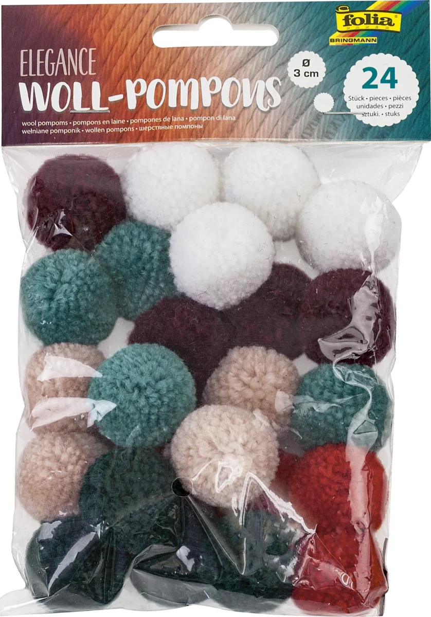 Sachets de 24 pompons en laine, diamètre 30mm. 3 modèles disponibles : Elégance/Party/Pastel
