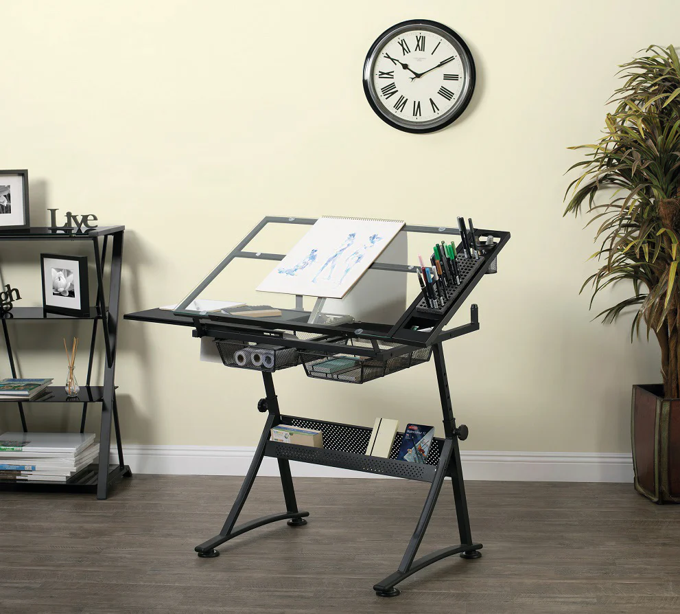 Ensemble complet, en acier noir, comprend une table à dessin avec deux paniers supplémentaires, un porte-marqueur ou un porte-crayon, une tablette latérale coulissante Idéale pour dessiner, peindre ou illustrer. Surface de travail inclinable à 45 degrés. La hauteur est également réglable, de 67 à 87cm. Plan de travail 91x61cm. La tablette escamotable reste à plat tandis que le plan de travail est incliné. Hauteur 61cm, surface de travail en verre, livrée non montée