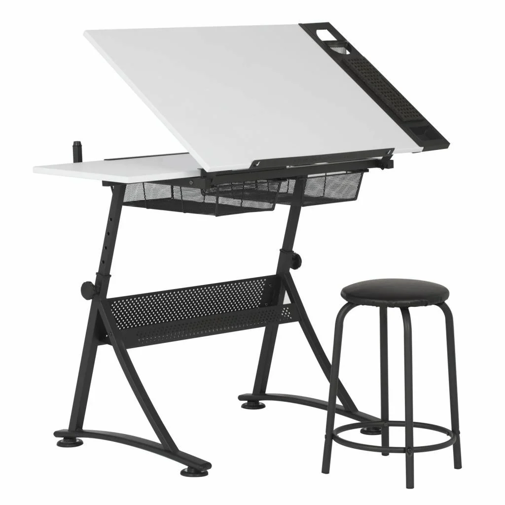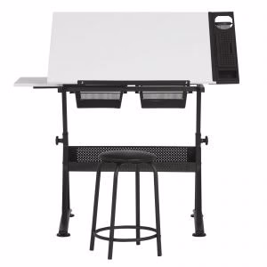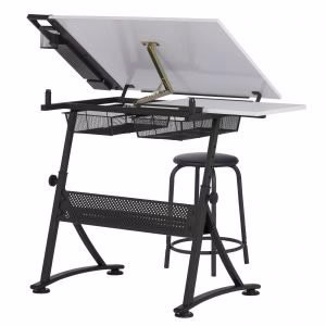 Ensemble complet, en acier noir, comprend une table à dessin avec deux paniers supplémentaires, un porte-marqueur ou un porte-crayon, une tablette latérale coulissante et un tabouret. Idéale pour dessiner, peindre ou illustrer. Surface de travail inclinable à 45 degrés. La hauteur est également réglable, de 67 à 87cm. Plan de travail 91x61cm. La tablette escamotable reste à plat tandis que le plan de travail est incliné. Livrée avec un tabouret, hauteur 61cm.