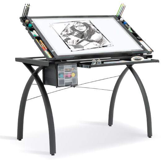 La table lumineuse Artograph Futura de Studio Designs combine les meilleures caractéristiques des deux marques pour créer une table lumineuse élégante et abordable. La construction durable de cette table à dessin, sa silhouette élégante ainsi que ses multiples options de rangement sont la raison pour laquelle il s’agit de notre bureau d’artiste le plus réussi. Le dessus en verre trempé comporte un coussin de lumière LED qui est fixé en dessous et fournit une source lumineuse qui s’étend sur toute la largeur et la profondeur du dessus de table. Le coussin lumineux à LED est dimmable et offre une luminosité variant de 500 à 5500 lumens. Avec un cadre en aluminium durable, le coussin lumineux offre une lumière froide et a une durée de vie de 50000 heures. Cette table lumineuse est idéale pour les tatoueurs et les illustrateurs qui cherchent à transférer / tracer un dessin. Idéal pour la calligraphie. dessin, scrapbooking, courtepointe et couture. Dimensions : 110 x 61 x 80 cm