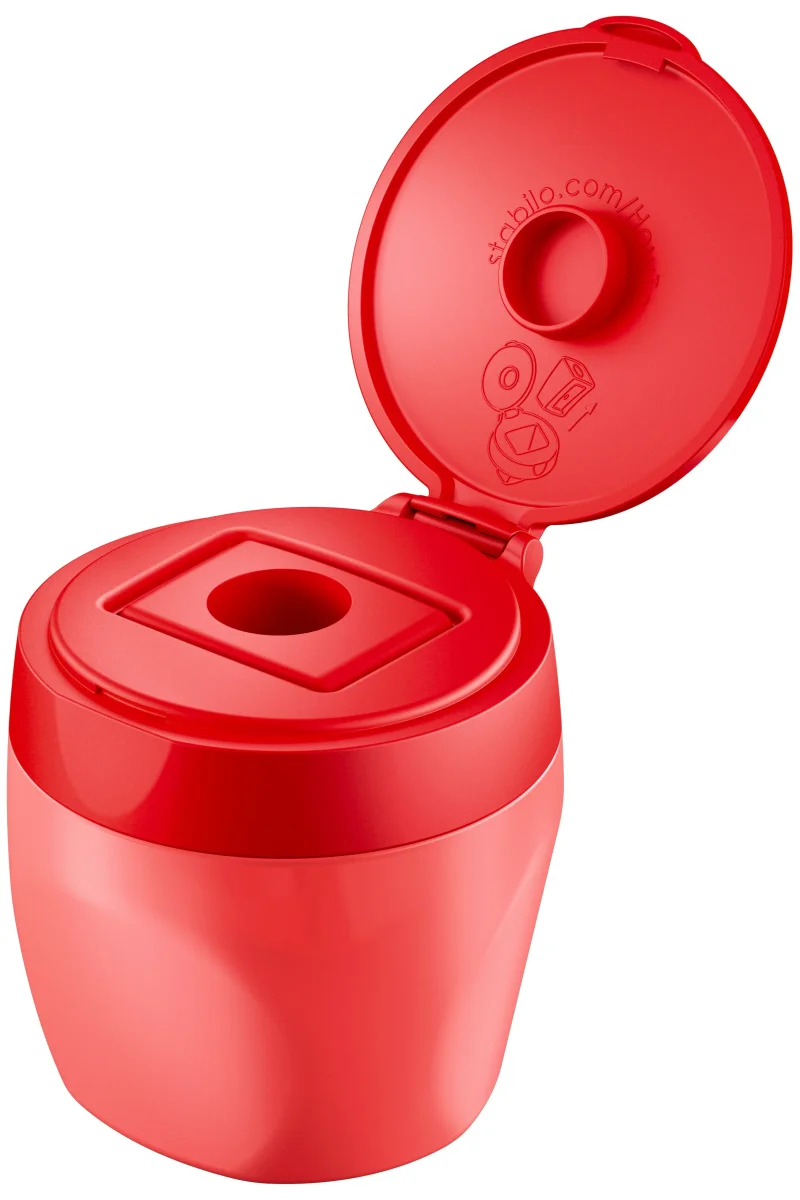 Le taille-crayon spécial avec réservoir et couvercle pour le crayon multi-talents STABILO woody 3 in 1, Réservoir de grande contenance pour les déchets de taille , Avec couvercle pour éviter de les disperser, Préformé pour une meilleure prise en main , Module de taille remplaçable , Sécurité enfant : les doigts ne peuvent pas entrer en contact avec la lame , Convient également au crayon marqueur STABILO MARKdry et aux crayons très larges à mine XXL de 10 mm