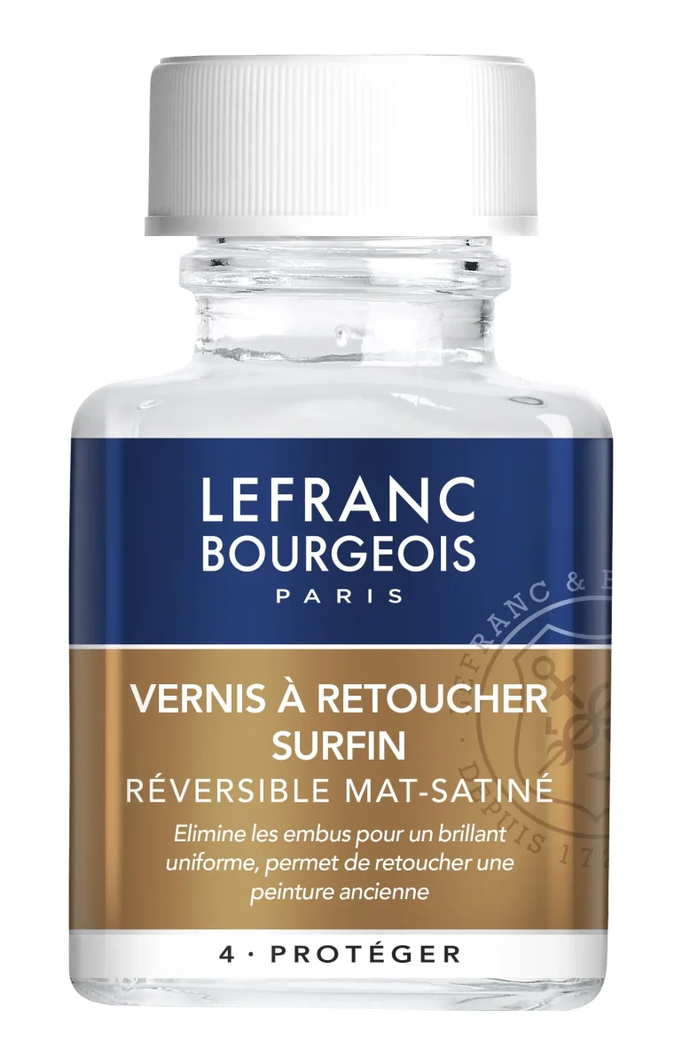 A la résine acrylique. Permet de superposer des couleurs fraîches sur d’anciennes couches. Elimine les zones mates des tableaux en fin de réalisation. Naturellement incolore, il ne jaunit pas en vieillissant. L’appliquer en frottis léger, avec une brosse douce et plus particulièrement sur les embus. Il faut être délicat dans cette opération, car se sont les zones les plus fragile.