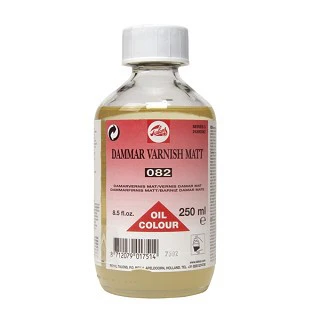 Protecteur des peintures à l’huile. C’est un vernis définitif traditionnel. Il est à appliquer après séchage complet de la couche de peinture. Il sèche en quelques heures. Il peut présenter après un certain temps des effets de vieillissement comme jaunir ou des craquelures. Il donne une brillance satinée. En le mélangeant avec le vernis Damar brillant, la degré de brillance augmentera. Peut s’enlever avec des solvant doux.