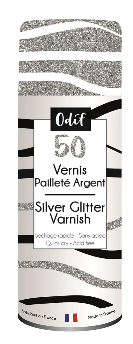 Vernis pailleté 50 Argent de la marque ODIF transparente et sans acide pour tout support.