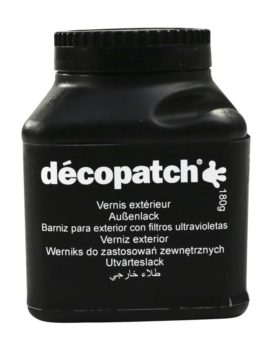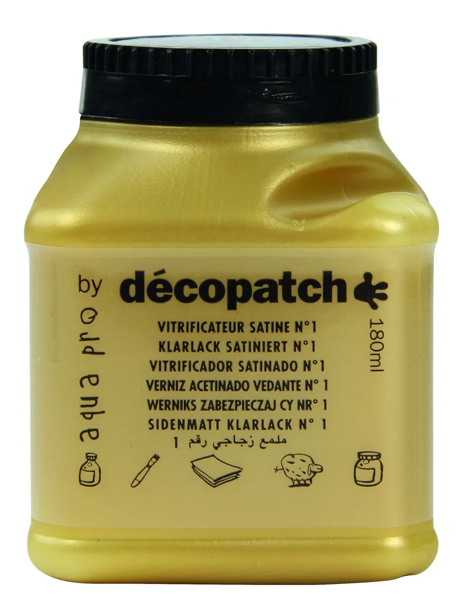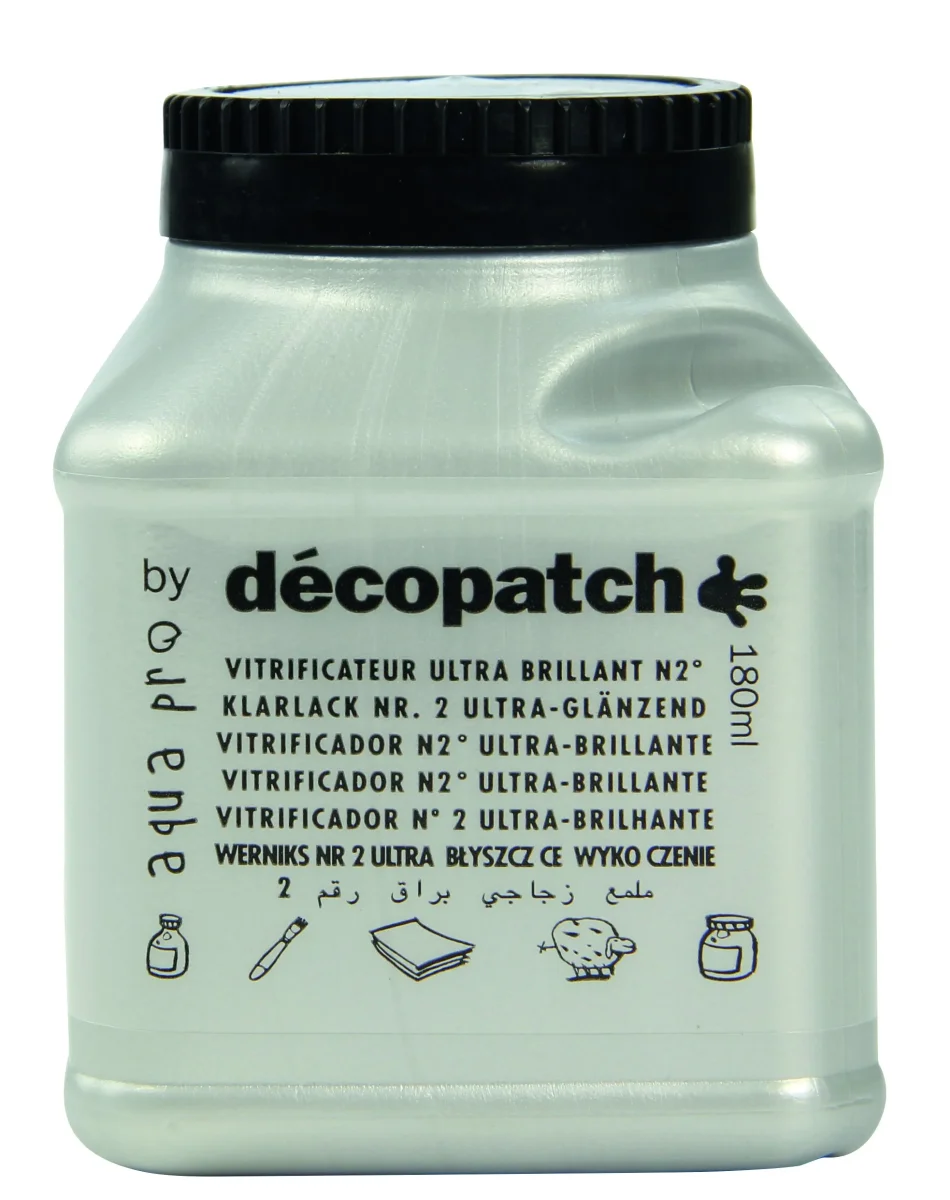 objets de la vie courante particulièrement ceux soumis à une utilisation fréquente. Il renforce la protection de vernis-colle Paperpatch avec lequel il est parfaitement compatible. Aquapro est également sans solvant et se nettoie à l’eau. Indispensable pour les objets décorés d’extérieur. Il offre un écran total à