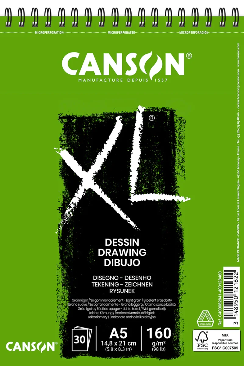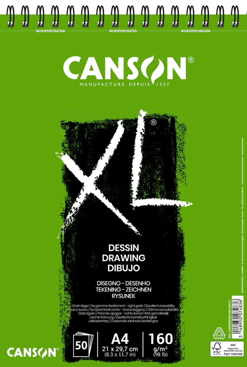 Album spiralé XL dessin, 50 feuilles de papier 160g/m² (seulement 30 feuilles pour le format A5), peut-être utilisé avec toutes les techniques; crayon, pastel, fusain et encre.Existe en A4 et A3 et A5