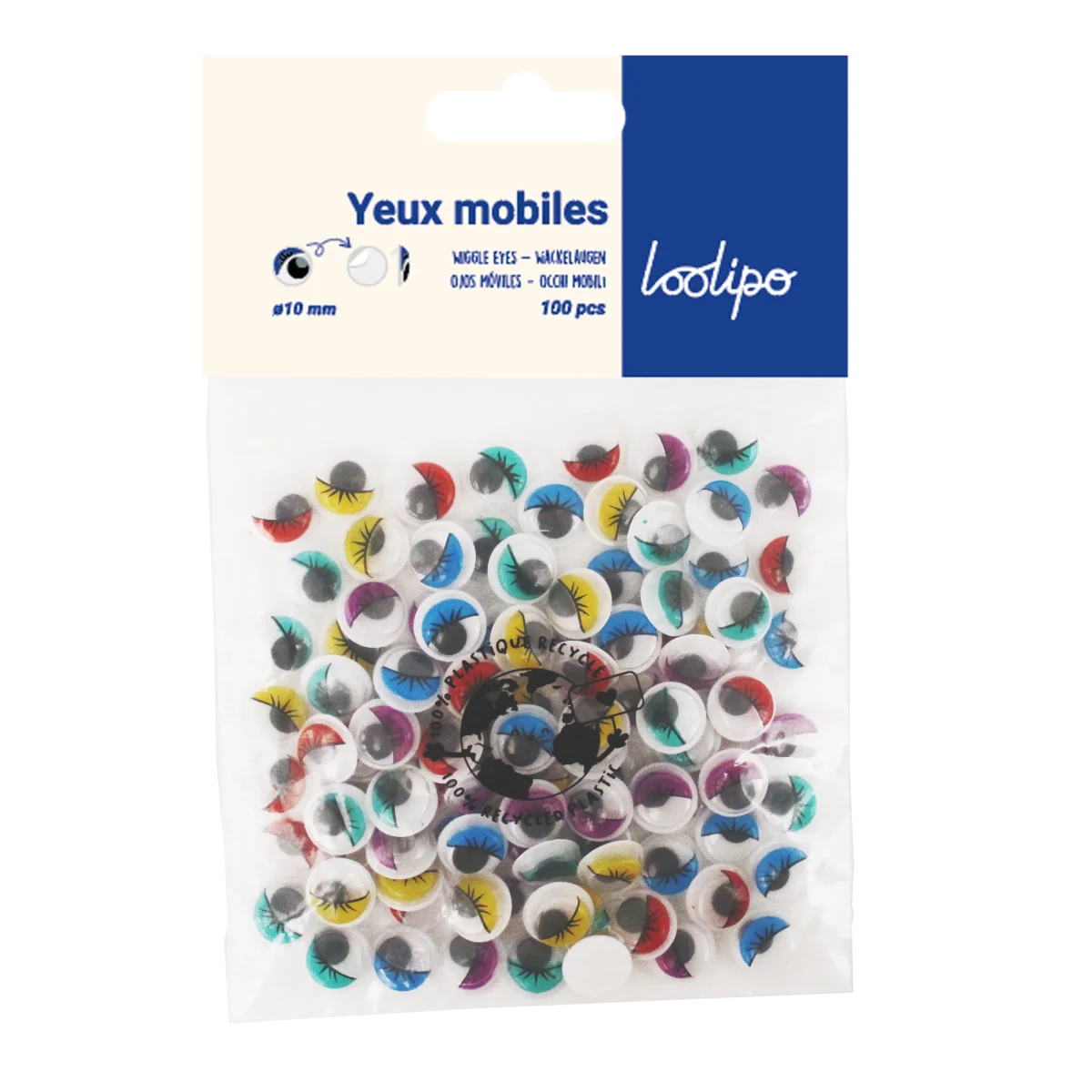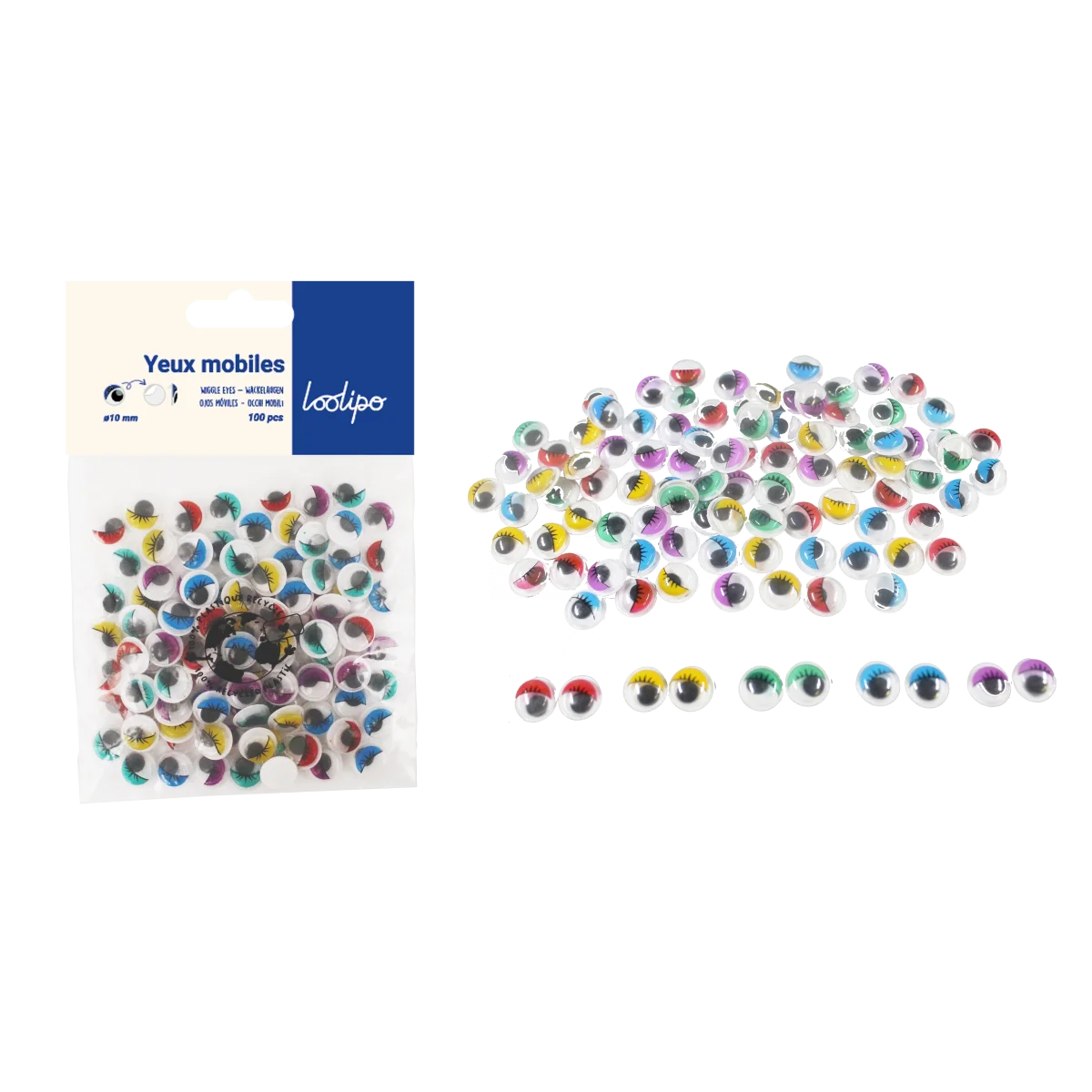 Sachets de 100 yeux mobiles couleurs adhésifs (10mm) avec ou sans cils noirs.